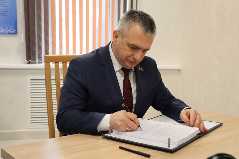 После торжественной части для гостей проведена экскурсия по новым помещениям. В актовом зале Дмитрий Гора и Иван Крупко оставили записи в Книге памяти.