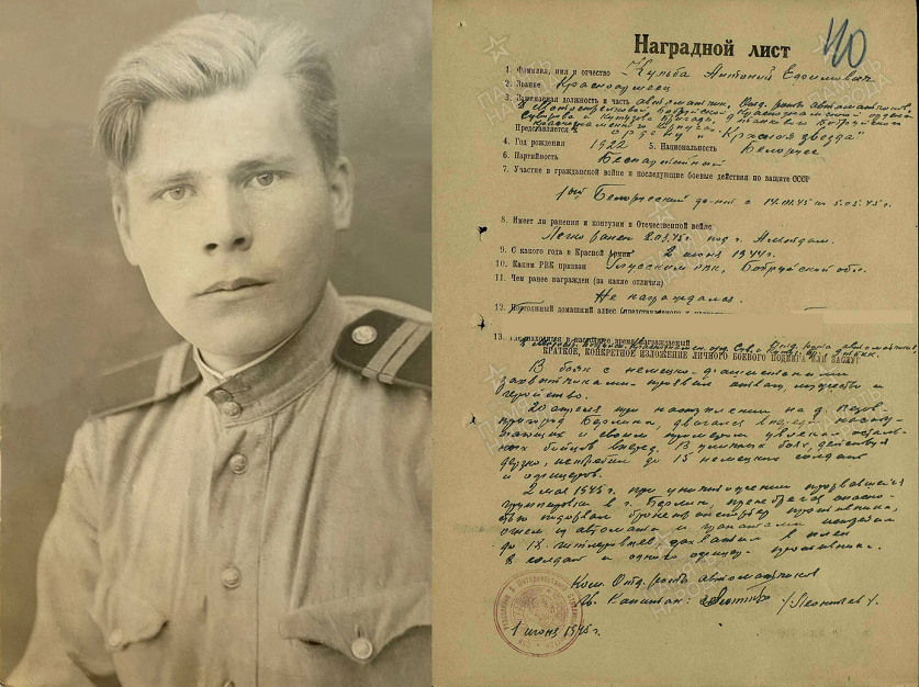 – Мой двоюродный прадед родился в 1922 году в деревне Устерхи Глусского района Могилевской области. Летом 1944 года был призван на фронт. Служил автоматчиком 8-й мотострелковой Бобруйской Краснознаменной орденов Суворова и Кутузова бригаде 9-го танкового Бобруйского краснознаменного корпуса.