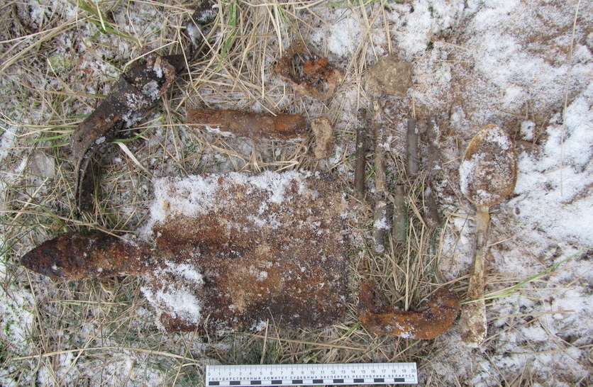 На место происшествия выбыла следственно-оперативная группа. При осмотре указанного участка местности были изъяты костные останки человека, а также часть лопаты, фрагменты ремня и обуви, алюминиевая ложка, гильзы и военная каска, в которой находились фрагменты документов.