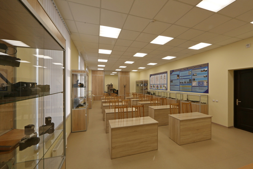 Помещение разделено на два сектора – лекционный кабинет и криминалистический полигон. В кабинете предусмотрена возможность демонстрации учебных фильмов и проведения обучающих видеоконференций. Установленные информационные стенды позволяют систематизировать и упростить запоминание значимой для проведения следственных действий информации. В классе также представлены тематические экспозиции, касающиеся служебных будней следователей нынешнего и предыдущего поколений.