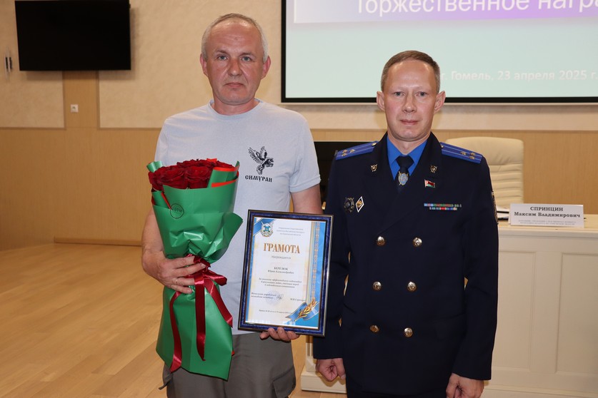 В завершение совещания состоялось торжественное награждение руководителя поисково-спасательного отряда «Симуран» Юрия Березюка, который принял непосредственное участие в раскрытии убийства жителя Гомеля в деревне Романовичи Гомельского района и предоставил значимую для следствия информацию. Начальник управления Следственного комитета Максим Спринцин поблагодарил опытного поисковика за неравнодушие и целеустремленность, отметил большой вклад добровольцев отряда в благородное дело помощи людям, потерявшим своих родных.