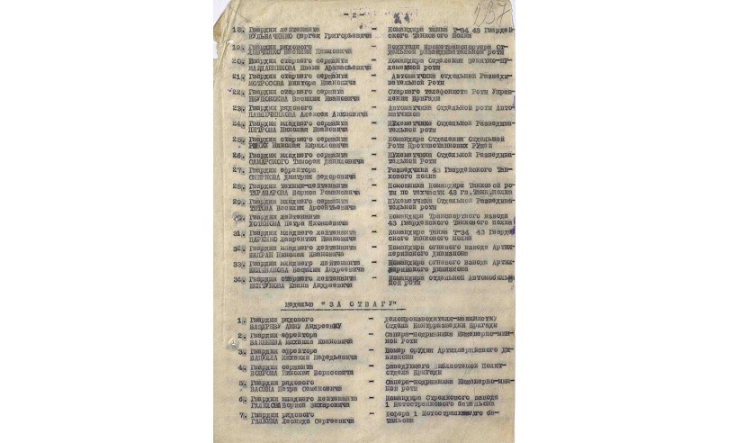 Выдержка из наградного листа о присвоении звания Героя Советского Союза гласит: «За время боев - от Витебска до Балтийского моря - сражался отважно и мужественно. Лично уничтожил 8 противотанковых орудий, самоходное орудие, 6 дзотов, 8 огневых точек, 8 автомашин, 7 повозок с военным имуществом, 2 склада с боеприпасами и до 65 оккупантов».