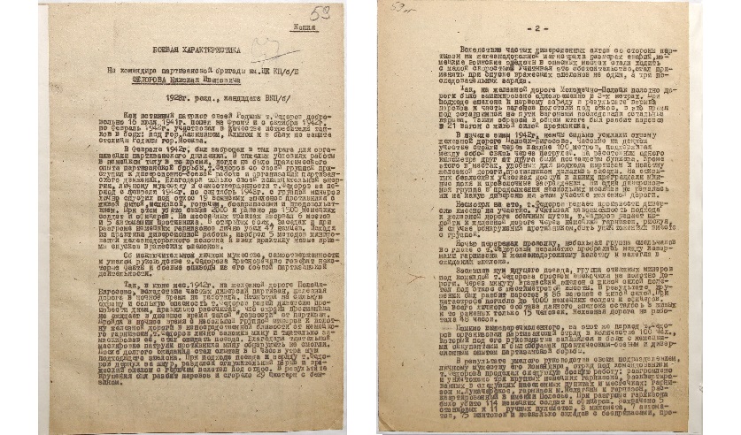 «В момент освобождения Островецкого района партизанской бригадой командовал Николай Иванович Федоров. Известно, что в феврале 1942 года он был направлен в тыл врага для организации партизанского движения. В короткий срок несмотря на тяжелые условия работы, благодаря лишь его организаторскому таланту и личному мужеству и самоотверженности, организовал партизанский отряд в количестве 100 человек. За короткий срок бригадой разгромлено несколько крупных немецких гарнизонов, в том числе гарнизоны: м. Островец, ст. Гудогай, перебито 500 рельс. В открытых боях и засадах убито 128 немцев, захвачено в плен 64 человека и взяты большие трофеи. Николая Ивановича характеризовали как смелого и решительного командира, который предан делу партии Ленина-Сталина и Социалистической Родине. В боях он проявлял стойкость, мужество, самоотверженность и умелое руководство подразделениями», - рассказала Виктория Дмитриевна.