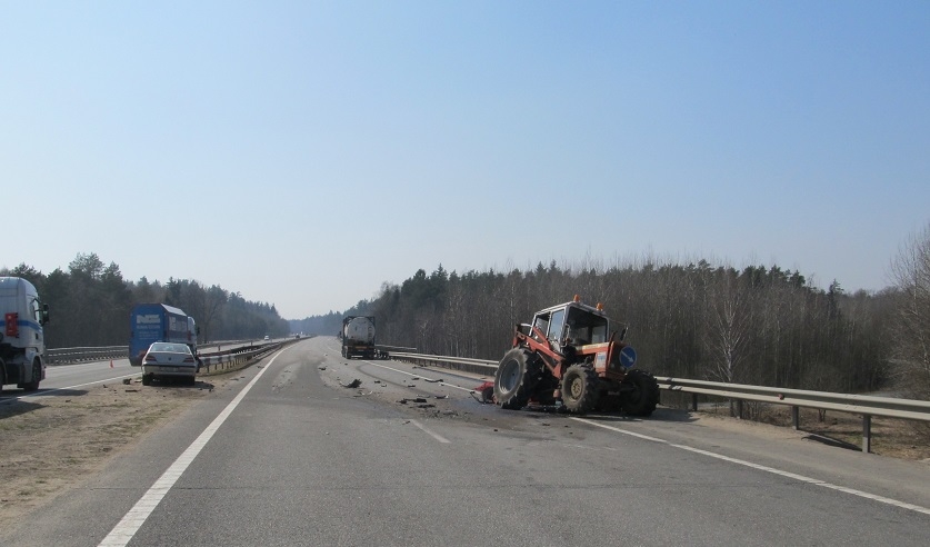 Днем 10 апреля текущего года 26-летний житель Смолевичского района, управляя личным легковым автомобилем Peugeot на автодороге М1 «Брест-Минск-граница Российской Федерации», вблизи п. Михановичи Минского района допустил столкновение с двигавшимся впереди него в попутном направлении с обозначенными дорожными знаками «Объезд препятствия» и «Дорожные работы» трактором МТЗ. После чего с указанными транспортными средствами столкнулся двигавшийся в том же направлении автопоезд Ford.