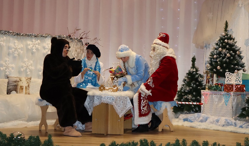 Для гостей силами педагогов и школьников был организован праздничный спектакль. В сказке Дед Мороз превратился в злого Деда Карачуна, но волшебная сила любви и добра вернула его в доброго героя. Снегурочка, Снежная Баба и другие герои в красочном представлении поздравили всех с наступающим Новым годом.