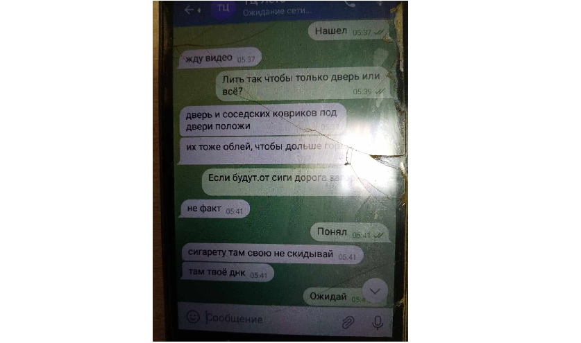 В апреле этого года куратор дал новые вводные: поджечь входную дверь в квартиру недобросовестного наркокурьера. Обязательное условие - снять «карательный процесс» на камеру мобильного телефона.