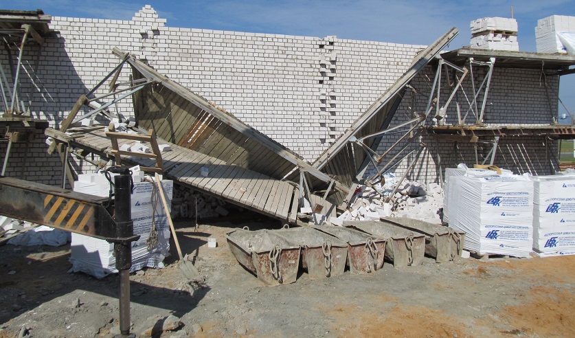 По указанию мастера строительно-монтажного участка рабочие находились на подмостях без страховочного троса, ожидая цементный раствор для кладки кирпичной стены. После погрузки поддонов с кирпичами на подмости с превышением допустимой нагрузки произошло их обрушение в зоне работы каменщика.
