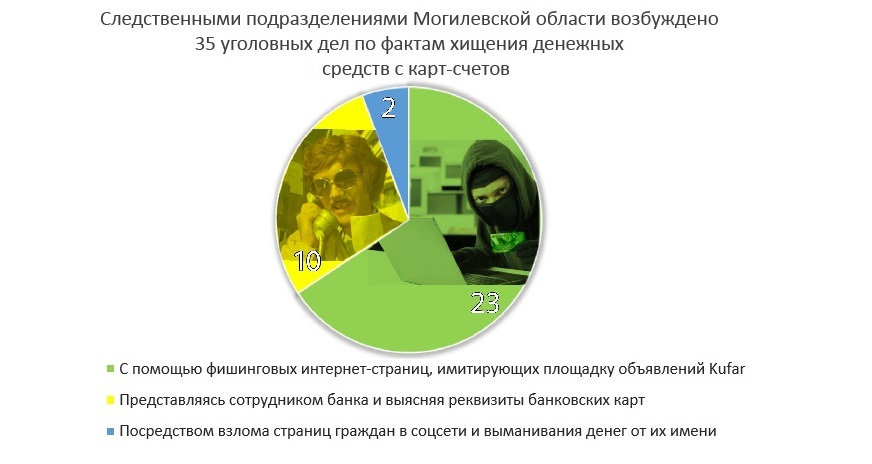 В основном злоумышленники завладевали реквизитами банковских карт с помощью фишинговых интернет-страниц, имитирующих площадку объявлений Kufar (23 уголовных дела). Под предлогом покупки различных товаров (автокресла, пальто, мотокультиватора, куртки, мобильного телефона, детской коляски и др.) в ходе общения потерпевшим предлагалось перейти по ссылке на фишинговую страницу, внешне схожую со страницей площадки Kufar, где последние вводили реквизиты своих банковских карт для якобы отправки на их счет оплаты за приобретаемый товар. После чего с банковской карты продавца незамедлительно списывались денежные средства.