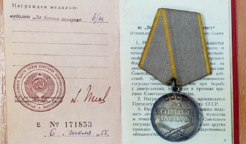 При прорыве линии обороны оккупантов северо-западнее г. Яссы (Румыния) во время артподготовки личным примером стойкости и мужества, находчивости и воинского умения воодушевлял остальной состав расчета на выполнение поставленных огневых задач. За этот подвиг моего деда наградили медалью «За боевые заслуги».