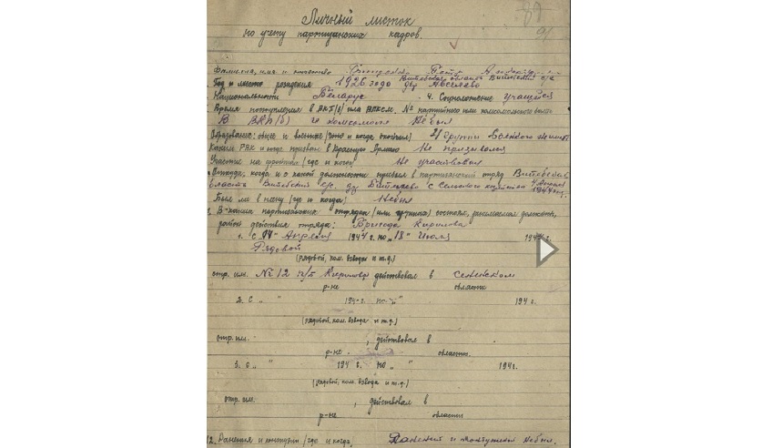 «Мой дед по линии матери, Грищенко Петр Александрович, родился в деревне Авселево Витебского района Витебской области 10 мая 1926 года. В возрасте 16-ти лет его вместе с братом схватили фашисты и заключили в концлагерь «5 полк» города Витебска. Благодаря смелости Петр смог сбежать. Судьба его брата неизвестна. Больше они не увиделись. В 17 лет мой дед примкнул к партизанскому отряду № 12 имени Кирилова, который действовал на территории Сенненского района Витебской области. В сохраненном учетном листке партизанских кадров значится: «Грищеко Петр Александрович за время службы в партизанском отряде как молодой партизан был исполнительным и дисциплинированным бойцом. Грищенко мужественно, самоотверженно сражался в боях против вражеской экспедиции».