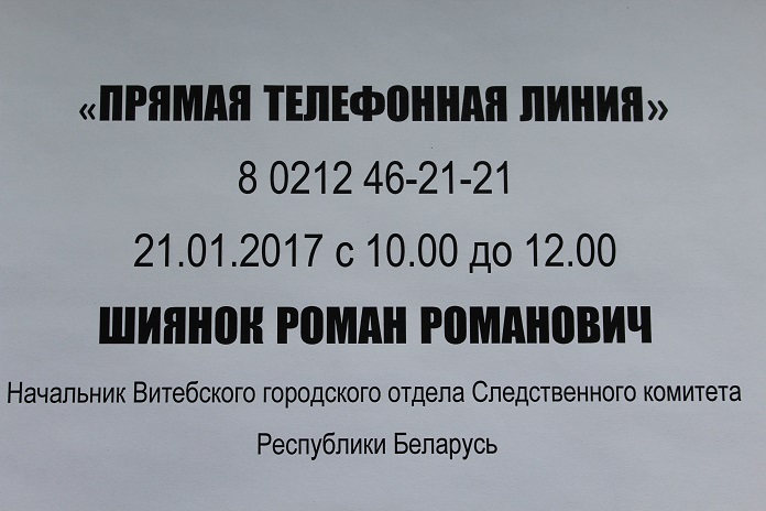 В субботу, 21 января 2017 года с 10.00 до 12.00 часов состоится «прямая телефонная линия» с начальником Витебского городского отдела Следственного комитета Шиянком Романом Романовичем.