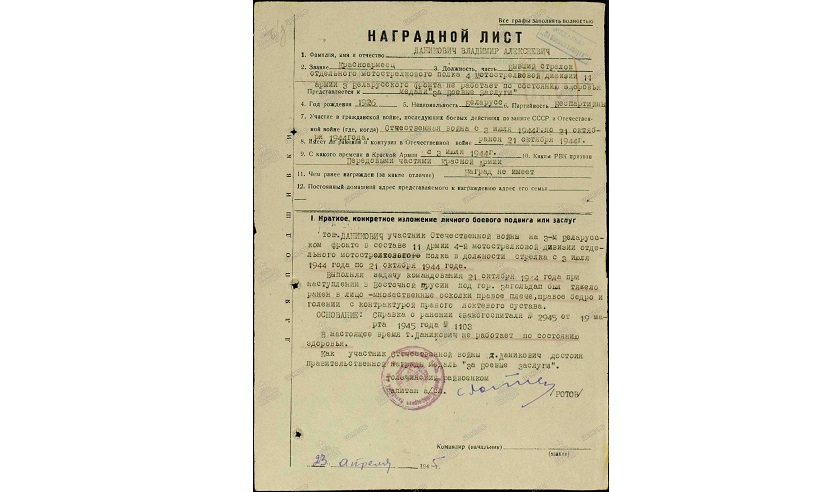 «Мой дед, Даникович Владимир Алексеевич, родился 28 сентября 1926 года в деревне Шупени Толочинского района. Когда началась Великая Отечественная война ему было 14 лет. 3 июля 1944 года он поступил на службу, пополнив ряды Красной Армии. Служил стрелком на 3 Белорусском фронте в составе 11 армии 4-й мотострелковой дивизии отдельного мотострелкового полка.