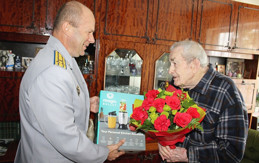 В свою очередь, Георгий Грошев поблагодарил офицеров за поздравление и рассказал о своем самочувствии, годах жизни, вспомнил события Великой Отечественной войны. Примечательно, что ветеран, как настоящий офицер, не безразличен к своей стране, всегда в курсе новостей, и, чтобы держать себя в тонусе, каждый день по мере сил делает физические упражнения.