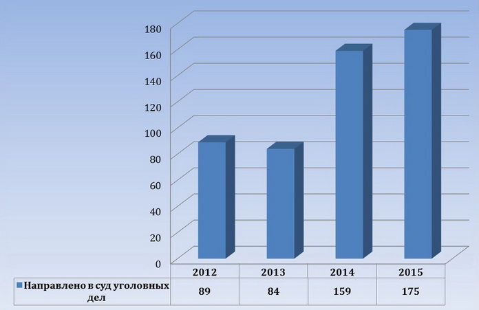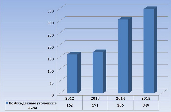 Аналогичным образом развивается ситуация с количеством возбужденных следователями уголовных дел (2012 – 162; 2013 – 171; 2014 – 306; 2015 – 349).