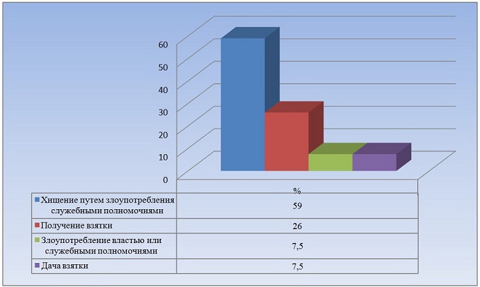 Анализируя отдельные виды преступлений, необходимо отметить, что 59 % от общего числа направленных в суд уголовных дел коррупционной направленности составляют хищения путем злоупотребления служебными полномочиями. К примеру, в производстве Чашникского районного отдела Следственного комитета Республики Беларусь находилось уголовное дело, возбужденное в отношении главного бухгалтера «Чашникского районного центра гигиены и эпидемиологии», возбужденное по ч.4 ст.210 (хищение путем злоупотребления служебными полномочиями) Уголовного кодекса Республики Беларусь. Должностное лицо перечислило с расчетного счета государственного учреждения на личный карт-счет денежные средства на сумму более 170 млн. белорусских рублей. В настоящее время судом Чашникского района постановлен обвинительный приговор. Главный бухгалтер приговорена к 5 годам лишения свободы с лишением права занимать руководящие должности. Одновременно необходимо отметить, что 26 % от общего числа направленных в суд уголовных дел коррупционной направленности составляют получения взятки, 7,5 % - злоупотребления властью или служебными полномочиями, 7,5 % - дачи взятки.