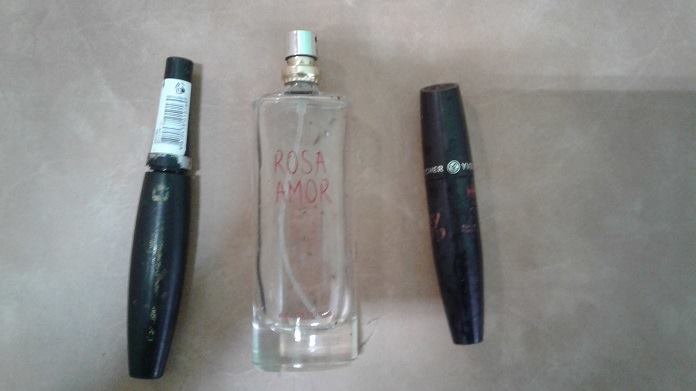 При ней обнаружены сумка черного цвета из кожзаменителя на комбинированном ремне с металлическими кольцами желтого цвета, в сумке - два тюбика туши для глаз, флакон туалетной воды, расческа, салфетки.