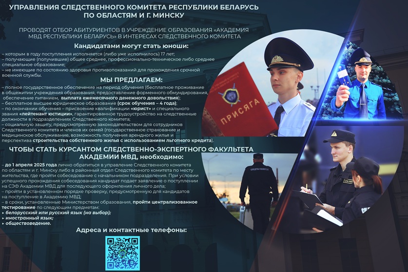 Подразделения Следственного комитета осуществляют отбор кандидатов для поступления в 2025 году на следственно-экспертный факультет учреждения образования «Академия Министерства внутренних дел Республики Беларусь» с целью обучения в интересах Следственного комитета.